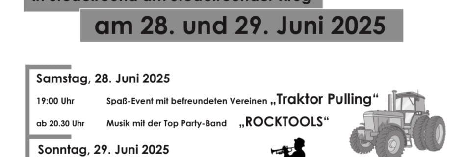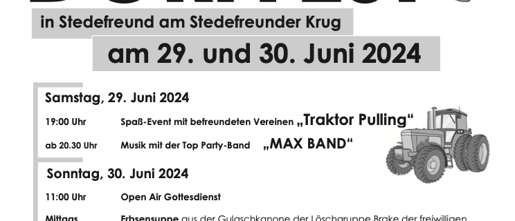 Heimatverein Stedefreund lädt ein zum Dorffest 2025 Feiern Sie mit uns beim traditionellen Dorffest in Stedefreund am Stedefreunder Krug! Wir haben ein spannendes und abwechslungsreiches Programm für Jung und Alt vorbereitet. Kommen Sie vorbei und genießen Sie zwei Tage voller Spaß, Musik und leckerem Essen.